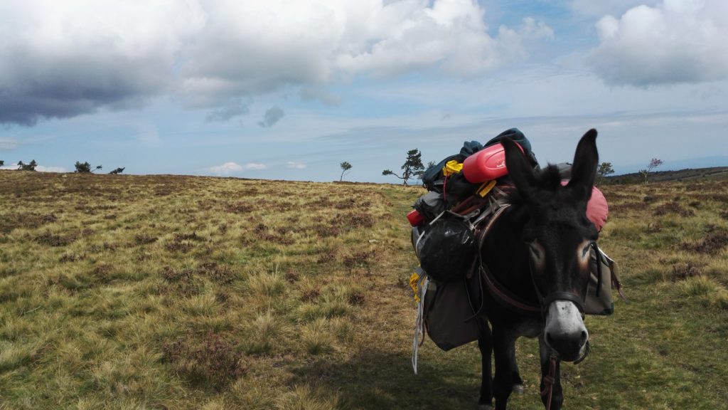 Nous sortons de la forêt, le paysage devint plus accidenté et semi-désertique. Un changement radical. Nous sommes arrivés au col du Béal (1390 m) en début d’après-midi. Un paysage ouvert sur des collines couleurs bruyère, ocrées par endroits, mauves tendre parmi des herbes semi-rigides, jaunies, couchées, peignées par des rafales de vent. Justement, celui-ci s’est levé sans prévenir.